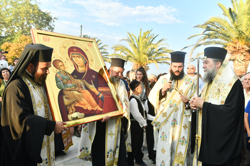 «Βηματίζοντες πνευματικώς στο πρώτο στάδιο της ευλογημένης περιόδου του ιερού Δεκαπενταυγούστου, ιδού ότι απόψε αξιωθήκαμε, από την χάρη της Παναγίας μας να υποδεχθούμε το σεπτό εικόνισμά Της σ’ αυτόν τον ιερό Ναό, με μία σεμνή τελετή, η οποία αποτελεί προπομπό του λαμπρού, συν Θεώ, τελεσθησομένου λειτουργικού εορτασμού της Κοιμήσεώς Της.