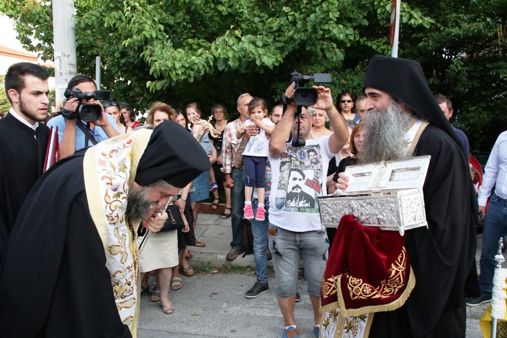 Ο Σεβ. Μητροπολίτης Σερρών και Νιγρίτης κ. Θεολόγος, επικεφαλής του ευαγούς ιερού κλήρου και του ευσεβούς λαού του Θεού, υπεδέχθη το χαριτόβρυτο ιερό λείψανο, το οποίο προσεκόμισαν, ο οσιολογιώτατος ιερομόναχος π. Παΐσιος και ο μοναχός π. Συμεών, έμπροσθεν του Ιερού Καθεδρικού και Προσκυνηματικού Ναού των Αγίων Θεοδώρων Σερρών.