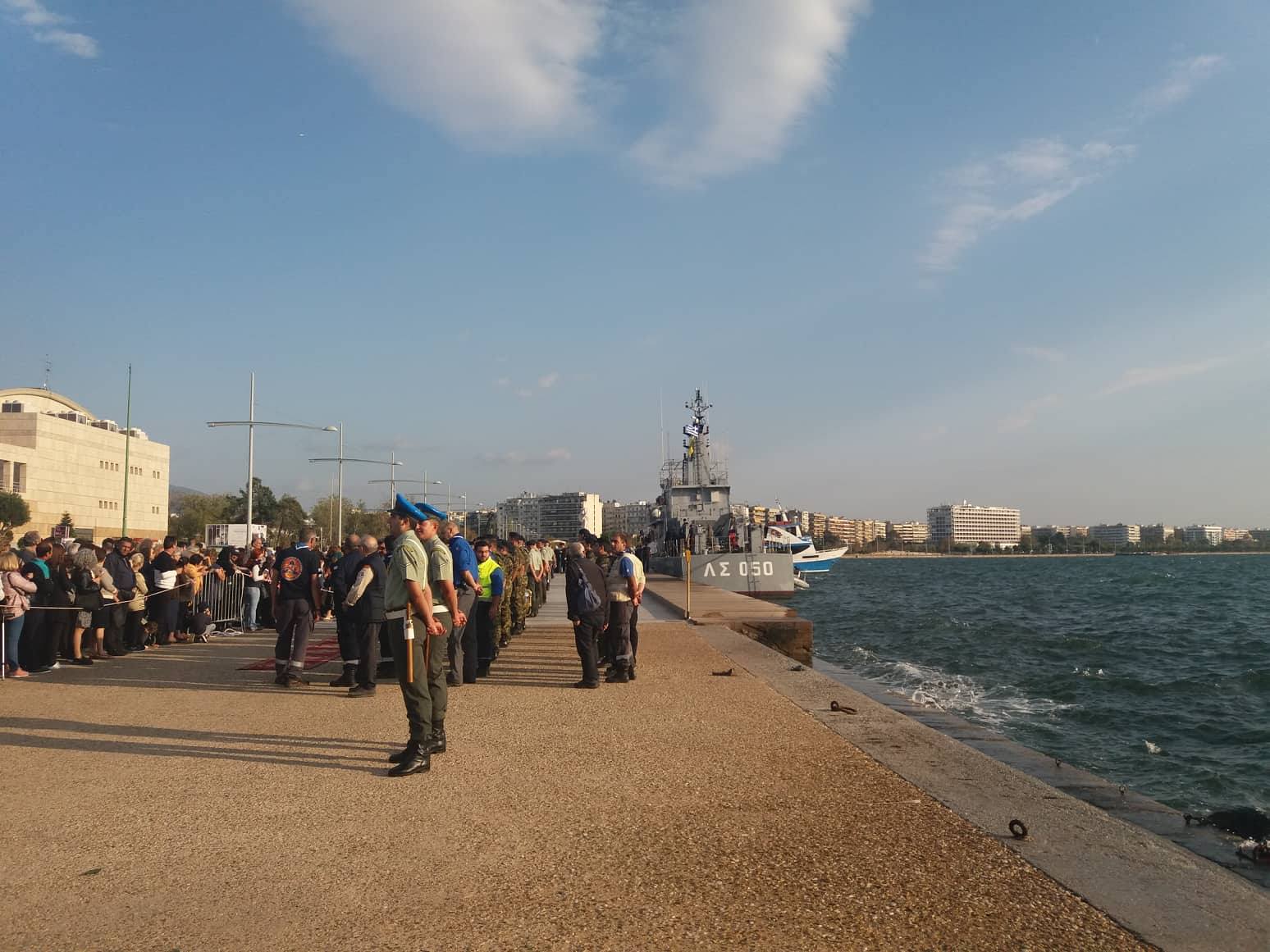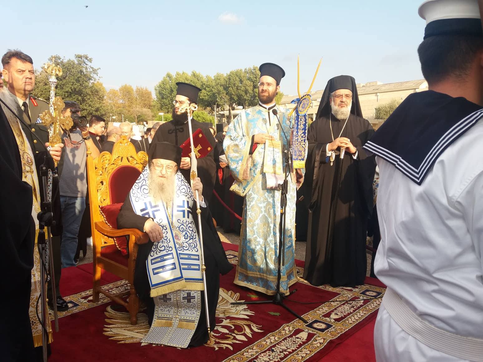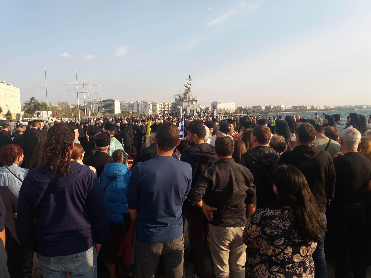 Κοσμοσυρροή στο Λευκό Πύργο για την υποδοχή της εικόνας της Παναγίας του Όρους των Ελαιών και του Τιμίου Σταυρού από το Πατριαρχείο των Ιεροσολύμων, που έφτασαν με τη συνδρομή του Περιπολικού Ανοιχτής Θαλάσσης “Αρκοί” (ΛΣ 050).