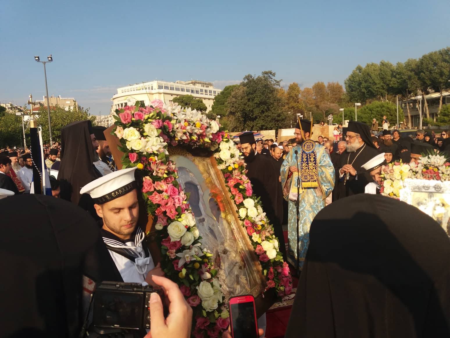 Η εικόνα της Παναγίας και ο Τίμιος Σταυρός έφτασαν στη Θεσσαλονίκη ενόψει των εορτασμών που τελούνται προς τιμή του Πολιούχου της πόλης, Αγίου Δημητρίου.