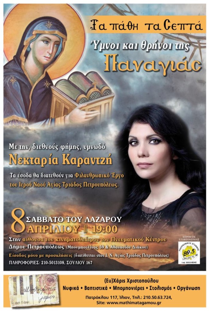 Το Σάββατο του Λαζάρου, 8 Απριλίου 2017, ώρα 19:00, στην αίθουσα του κινηματοθεάτρου του Πνευματικού Κέντρου Δήμου Πετρουπόλεως (Μπουμπουλίνας 59 & Αθανασίου Διάκου) η διεθνώς αναγνωρισμένη υμνωδός του βυζαντινού μέλους Νεκταρία Καραντζή, θα παρουσιάσει ένα μουσικό αφιέρωμα στο πλαίσιο των κατανυκτικών ημερών του Πάσχα, με Ύμνους και Θρήνους της Παναγίας.