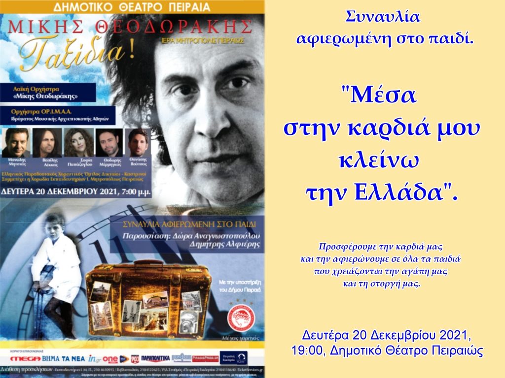 H Ι.Μητρόπολη Πειραιώς θέλοντας να στηρίξει ενεργά και ουσιαστικά τα παιδιά, τις πολύτεκνες οικογένειες και την ελπιδοφόρα νεότητα που αποτελεί το μέλλον της πατρίδος μας, διοργανώνει την Δευτέρα 20 Δεκεμβρίου στις 19:00 στο Δημοτικό Θέατρο Πειραιώς, μεγάλη Συναυλία αφιερωμένη στο παιδί με γενικό σύνθημα «Μέσα στην καρδιά μου κλείνω την Ελλάδα».