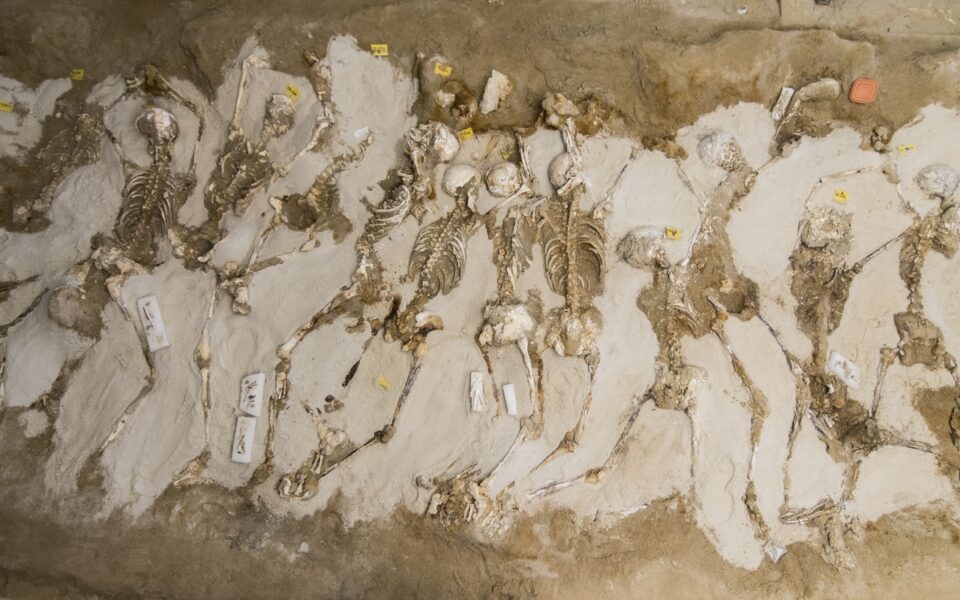 Τα αρχαιολογικά ευρήματα αφορούν τρεις ομαδικούς τάφους στους οποίους βρέθηκαν πάνω από 70 σκελετοί ανδρών που χρονολογούνται στον 7ο αι. π.Χ., ορισμένοι από τους οποίους φέρουν κρίκους στα οστά των χεριών, ενώ άλλοι βρέθηκαν θαμμένοι με τα χέρια σηκωμένα στο κεφάλι. Τα ευρήματα προκάλεσαν το διεθνές ενδιαφέρον και πυροδότησαν διάφορα σενάρια για τις συνθήκες ταφής και εκτέλεσής τους. Το πρόβλημα με τα ευρήματα, όμως, ήταν από την αρχή η διαχείρισή τους. Η πρώτη σχετική απόφαση του ΚΑΣ όριζε την κατά χώρα διατήρησή τους, αλλά αργότερα αποδείχθηκε ότι ο ρυθμός φθοράς των οστών ήταν μεγάλος λόγω της υψηλής υγρασίας της περιοχής.