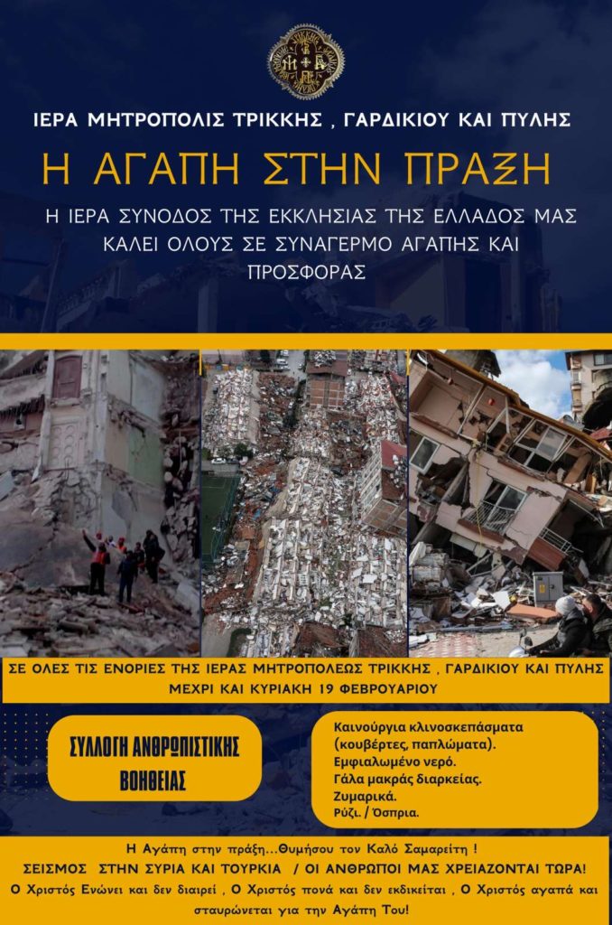 Ἡ ἹερὰΜητρόπολη Τρίκκης, Γαρδικίου καὶ Πύλης, ἀνταποκρινόμενη στην ἔκκληση τῆς Ἱερᾶς Συνόδου τῆς Ἐκκλησίας τῆς Ἑλλάδος θὰ προχωρήσει στή συγκέντρωση ἀνθρωπιστικοῦ ὑλικοῦ για τοὺς σεισμοπαθεὶς τῆς Τουρκίας καὶ τῆς Συρίας.