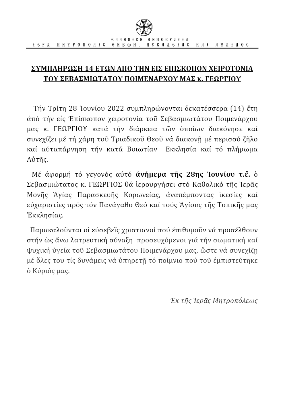 Ανακοίνωση εξέδωσε η Μητρόπολη Θηβών και Λεβαδείας, σύμφωνα με την οποία, την Τρίτη, 28 Ιουνίου, συμπληρώνονται 14 χρόνια από την εις Επέικοπον χειροτονία του Μητροπολίτου κ. Γεωργίου.