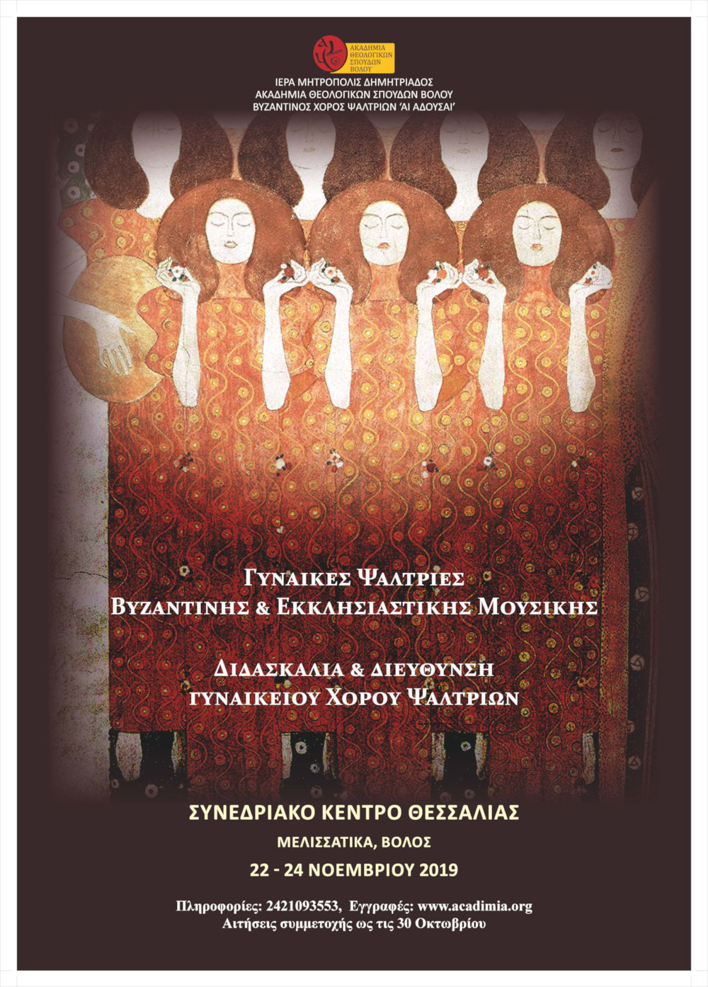 Το 1ο Συμπόσιο Ορθοδόξων Ψαλτριών του ορθόδοξου ανατολικού μέλους και το 1ο Φεστιβάλ Χορών Ψαλτριών «Αγία Καικιλία» θα πραγματοποιηθεί στο Συνεδριακό Κέντρο Θεσσαλίας το διήμερο 22-23/11/2019.