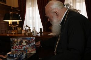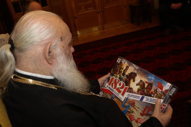 Ο κ. Δεσύλλας προσέφερε στον Αρχιεπίσκοπο την επετειακή σειρά επιτραπέζιων παιχνιδιών για το 1821 της εταιρείας, τα οποία τελούν υπό την αιγίδα του Πολεμικού Μουσείου.