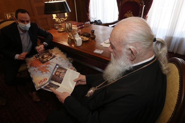Ο κ. Δεσύλλας προσέφερε στον Αρχιεπίσκοπο την επετειακή σειρά επιτραπέζιων παιχνιδιών για το 1821 της εταιρείας, τα οποία τελούν υπό την αιγίδα του Πολεμικού Μουσείου.