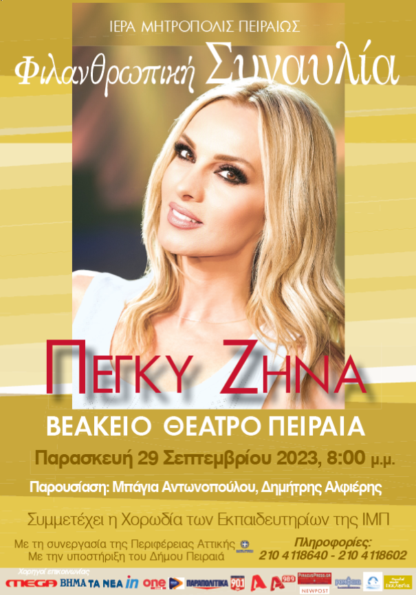 Η γνωστή ερμηνεύτρια ΠέγκυΖήναθα τραγουδήσει στην Φιλανθρωπική Συναυλία που διοργανώνει, για μία ακόμη φορά, η Ι.Μητρόπολη Πειραιώςσε συνεργασία με την Περιφέρεια Αττικής και την υποστήριξη του Δήμου Πειραιά, την Παρασκευή 29 Σεπτεμβρίου 2023, στις 20:00, στο Βεάκειο Θέατρο Πειραιά.