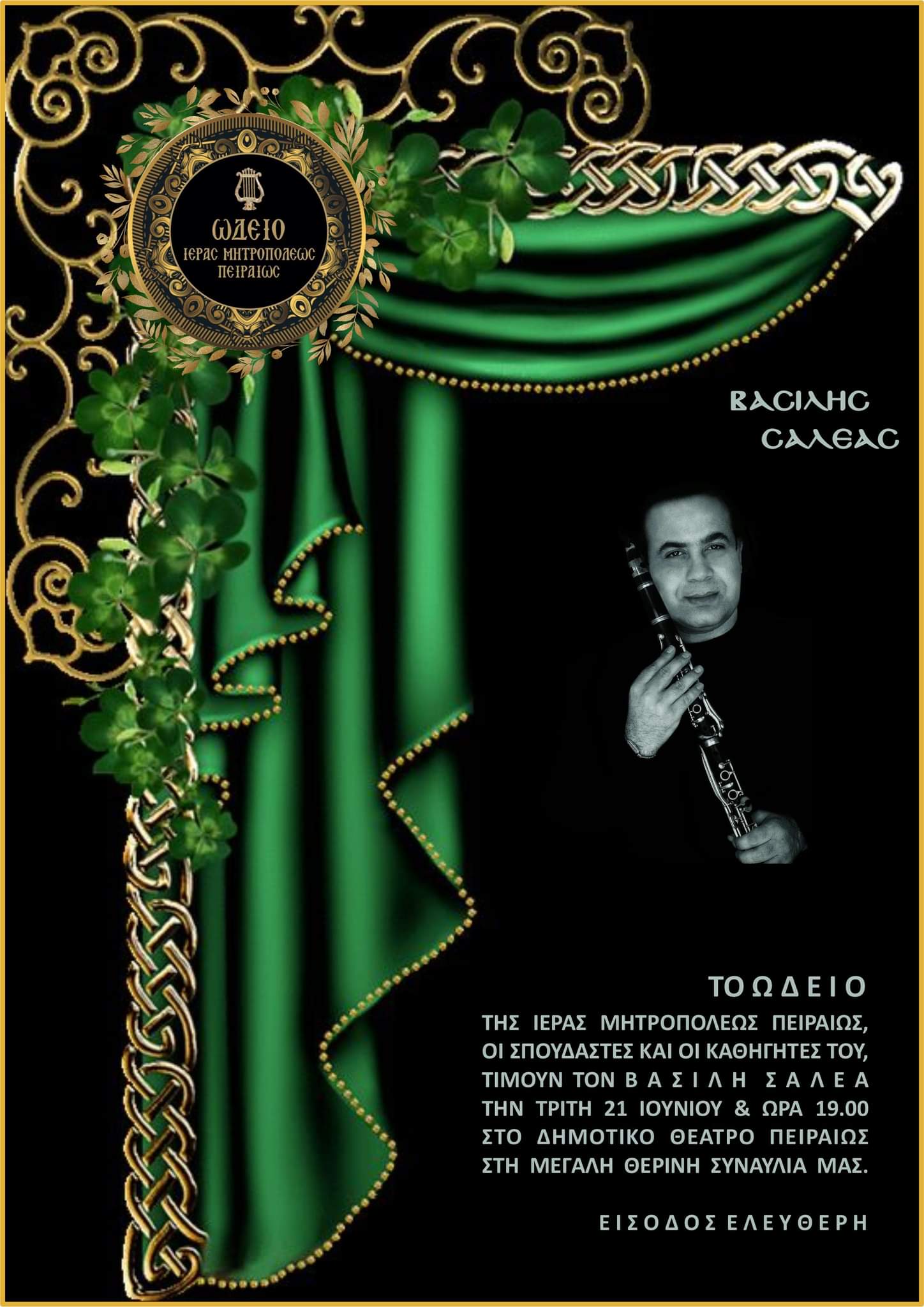 Μετά το πέρας της συναυλίας, θα βραβευθεί από το Ωδείο και τον Μητροπολίτη Πειραιώς κ. Σεραφείμ ο διεθνούς φήμης Solist του Κλαρίνου Βασίλης Σαλέας, ενώ θα λάβουν όλοι οι σπουδαστές Αναμνηστικό Επαινο.