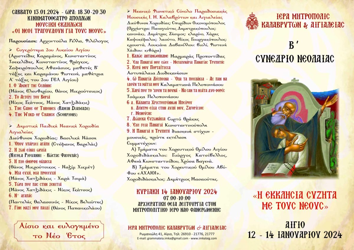 Η Ιερά Μητρόπολη Καλαβρύτων και Αιγιαλείας, στο πλαίσιο της ποιμαντικής μέριμνας του Σεβασμιωτάτου Μητροπολίτου μας κ. Ιερωνύμου και με διάθεση ουσιαστικής επικοινωνίας, ειλικρινούς διαλόγου και συμπροβληματισμού με τους νέους μας, διοργανώνει το Β΄ Συνέδριο Νεολαίας, με θεματικό τίτλο: «Η ΕΚΚΛΗΣΙΑ ΣΥΖΗΤΑ ΜΕ ΤΟΥΣ ΝΕΟΥΣ».