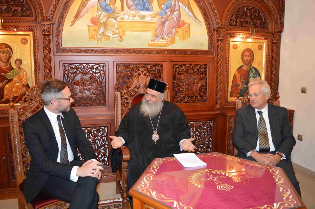 Ο κ. Ροτ επισκέφθηκε χθες το επισκοπείο της Νεάπολης προκειμένου να συναντηθεί με τον κ. Βαρνάβα. Ο κ. Βαρνάβας, αφού τον καλωσόρισε στην μητρόπολή του, τον ξενάγησε στο ναό του Τιμίου Προδρόμου που βρίσκεται δίπλα από το επισκοπείο.