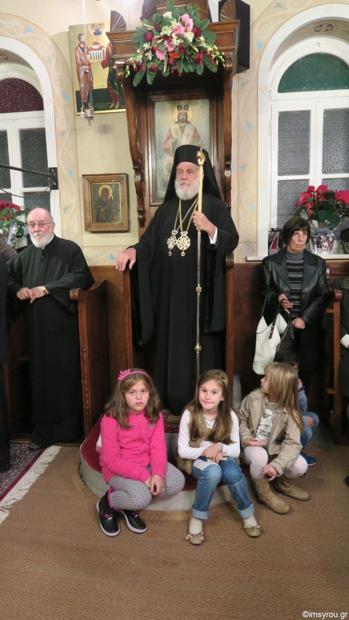 Στον Εόρτιο Εσπερινό,που τελέσθηκε την Κυριακή 11 Δεκεμβρίουυ 2016, στον πανηγυρίζοντα Ιερό Ναό του Αγίου Σπυρίδωνος Χρούσσων, χοροστάτησε απόψε ο Σεβασμιώτατος Μητροπολίτης Σύρου κ. Δωρόθεος Β’ , συμπαραστατούμενος από Εφημερίους και Διακόνους της Σύρου, με τη συνευχητική παρουσία του Αξιοτίμου Δημάρχου Σύρου-Ερμούπολης κ. Γ. Μαραγκού, της Πολιτευτού Κυκλάδων κας Αικ. Μονογυιού και πλήθους Συρίων προσκυνητών, οι οποίοι συνέρρευσαν στην παραθεριστική αυτή περιοχή, να προσκυνήσουν την εικόνα του Αγίου και να εκζητήσουν την προστασία του.