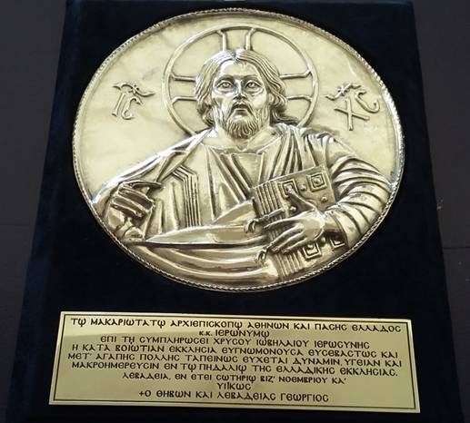 Πριν την απόλυση ο Σεβασμιώτατος Ποιμενάρχης μας κ. Γεώργιος αναφέρθηκε στον Μακαριώτατο Αρχιεπίσκοπο Αθηνών και πάσης Ελλάδος κ. Ιερώνυμο, ο οποίος φέτος συμπληρώνει 50 έτη δημιουργικής ιερατικής διακονίας, τα περισσότερα από τα οποία διηκόνησε στην Τοπική μας Εκκλησία. Ανέφερε πως στην εκκλησιαστική και στην κοινωνική ζωή της Βοιωτίας υπάρχει έντονη η προσωπική σφραγίδα του ευλογημένου περάσματος του Μακαριωτάτου. Και ευχήθηκε στον Μακαριώτατο δύναμη, υγεία, και μακροημέρευση προσφέροντάς του, επί τη συμπληρώσει χρυσού ιωβηλαίου ιερωσύνης, το μετάλλιο με τον Παντοκράτορα της Μονής του Οσίου Λουκά ως ένδειξη ευγνωμοσύνης, σεβασμού και αγάπης της κατά Βοιωτίαν Εκκλησίας.