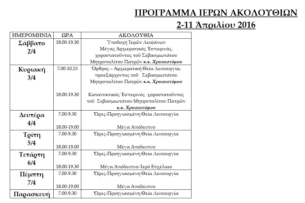 Αμέσως μετά την υποδοχή θα τελεστεί Μέγας Αρχιερατικός Εσπερινός, ενώ καθημερινά θα τελούνται Ιερές Ακολουθίες σύμφωνα με το ως κάτωθι Πρόγραμμα.