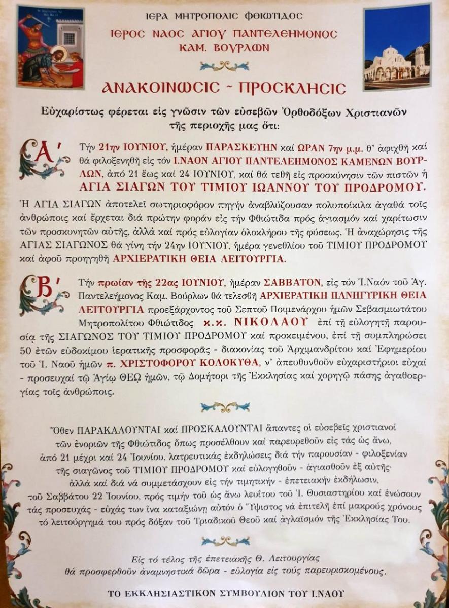 Φέρεται εις γνώσιν των ευσεβών πιστών, ότι την Παρασκευή 21 Ιουνίου στις 7 το απόγευμα η πόλις των Καμένων Βούρλων θα υποδεχθεί δια πρώτη φορά την αγία Σιαγώνα του Τιμίου Προδρόμου και Βαπτιστού Ιωάννου, η οποία και θα παραμείνει στον Ιερό Ναό προς αγιασμό των πιστών έως και την Δευτέρα 24 Ιουνίου, Εορτή του Γενεθλίου του Τιμίου Προδρόμου.
