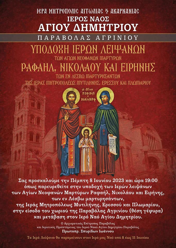 Ο Ιερός Ναός Αγίου Δημητρίου Παραβόλας Αγρινίου υποδέχεται το 4ημερο 8 έως 11 Ιουνίου 2023 τα Ιερά Λείψανα των Νεοφανών Μαρτύρων Ραφαήλ Νικολάου και Ειρήνης από την Ιερά Μητρόπολη Μυτιλήνης Ερεσσού και Πλωμαρίου.
