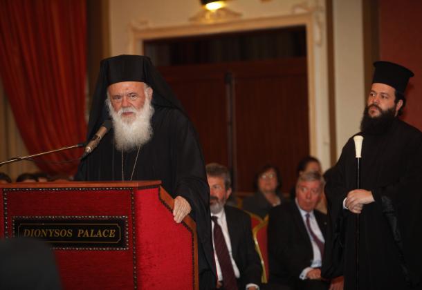 Ο Αρχιεπίσκοπος έφτασε στην αίθουσα της εκδήλωσης συνοδευόμενος από τον Αρχιγραμματέα της Ιεράς Συνόδου της Εκκλησίας της Ελλάδος Επίσκοπο Διαυλείας κ. Γαβριήλ, ενώ τους υποδέχθηκε ο Μητροπολίτης Μεγάρων και Σαλαμίνος κ. Βαρθολομαίος.