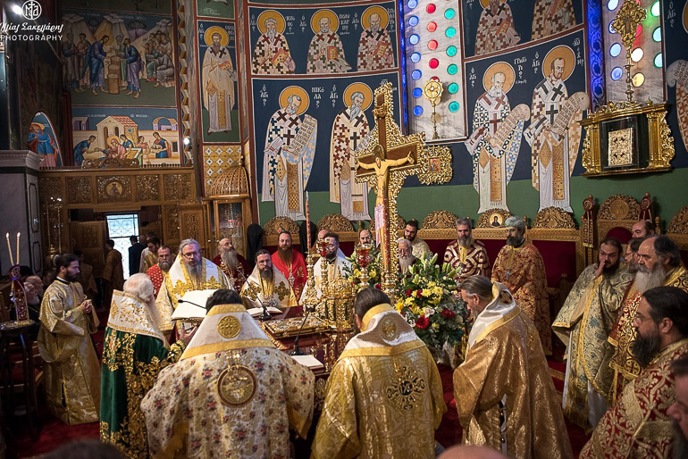Ανήμερα της εορτής, τελέστηκε πανηγυρική, πολυαρχιερατική Θεία Λειτουργία στον Ιερό Ναό Αναλήψεως του Χριστού Βόλου, εν πληθούση Εκκλησία, ιερουργούντος του Σεβ. Ποιμενάρχου μας κ. Ιγνατίου, συλλειτουργούντων των Σεβ. Μητροπολιτών Μεσσηνίας κ. Χρυσοστόμου, Λαρίσης & Τυρνάβου κ. Ιερωνύμου, Πολυανής & Κιλκισίου κ. Βαρθολομαίου, Αιτωλίας & Ακαρνανίας κ. Δαμασκηνού, των Θεοφ. Επισκόπων Ολβίας κ. Επιφανίου και Νειλουπόλεως κ. Νικοδήμου, συμπροσευχομένου του Σεβ. Μητροπολίτου Φωκίδος κ. Θεοκτίστου.