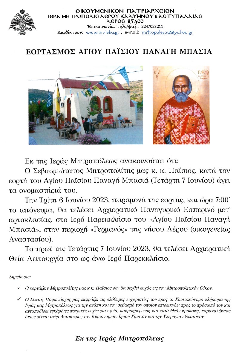 Τα Ονομαστήρια του Μητροπολίτου Καλύμνου, Λέρου και Αστυπαλαίας κ. Παϊσίου, θα εορτασθούν σύμφωνα με το ακόλουθο Πρόγραμμα: