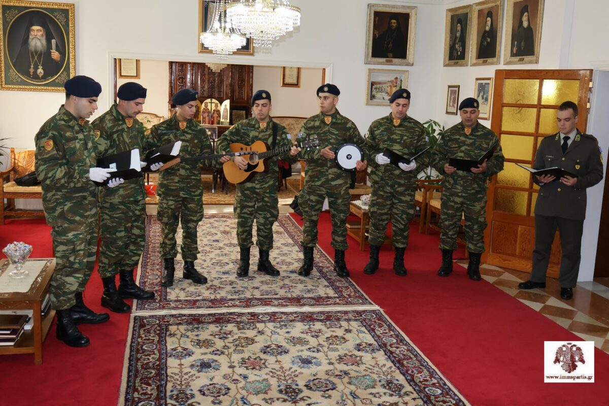 Ως είθισται, το Επισκοπείο επισκέφθηκε η χορωδία του Κέντρου Εκπαιδεύσεως Εφοδιασμού Μεταφορών, για να ψάλλει τα Κάλαντα. Ο σεπτός Ποιμενάρχης μας ευχαρίστησε τον επικεφαλής υπαξιωματικό και τους στρατευμένους για την παρουσία τους, ενώ τους ευχήθηκε το νέο έτος να συνοδευτεί από υγεία, χαρά και κατά Θεόν προκοπή για τους ίδιους και τις οικογένειές τους. Ακολούθησε το καθιερωμένο κέρασμα.