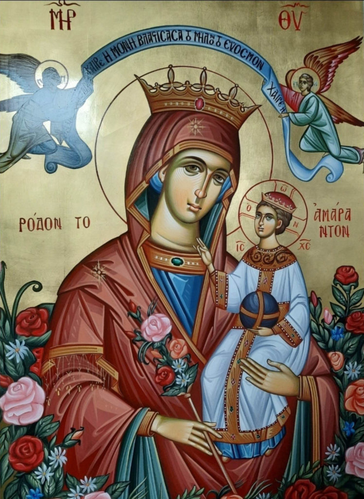 Μέγας Πανηγυρικός Εσπερινός μετ’ αρτοκλασίας και Θείου Κηρύγματος. Εν συνεχεία Ιερά Λιτανεία της Ιεράς Εικόνος της Πανάγιας «ΡΟΔΟΝ ΤΟ ΑΜΑΡΑΝΤΟΝ» σε οδούς της ενορίας. Μετά το πέρας θα προσφερθεί παραδοσιακή φιλοξενία και θα ακολουθήσει Εκδήλωση από τα χορευτικά τμήματα του Συλλόγου «Φαλώρεια».