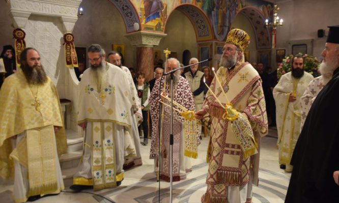 Ο Σεβασμιώτατος Μητροπολίτης Τρίκκης, Γαρδικίου και Πύλης κ. Χρυσόστομος Χοροστάτησε κατά τη διάρκεια του Όρθρου και προεξήρχε της Θείας Λειτουργίας, ενώ έψαλλε ο χορός των Πατέρων της Ιεράς Μονής Δουσίκου.