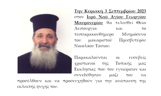 Την Κυριακή, 3 Σεπτεμβρίου 2023, θα τελεστεί το Τεσσαρακονθήμερο Μνημόσυνο του μακαριστού π. Νικολάου Τάσιου, στη Μητρόπολη θηβών, σύμφωνα με το ακόλουθο Πρόγραμμα: