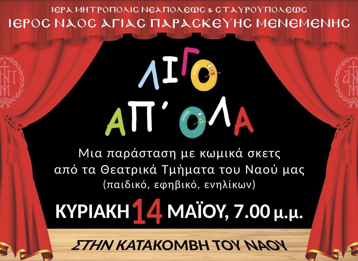 Θεατρική παράσταση στον Ι.Ν.Αγίας Παρασκευής Μενεμένης, της Μητρόπολης Νεαπόλεως και Σταυρουπόλεως, θα πραγματοποιηθεί την Κυριακή, 14 Μαΐου 2023, σύμφωνα με το κάτωθι Πρόγραμμα: