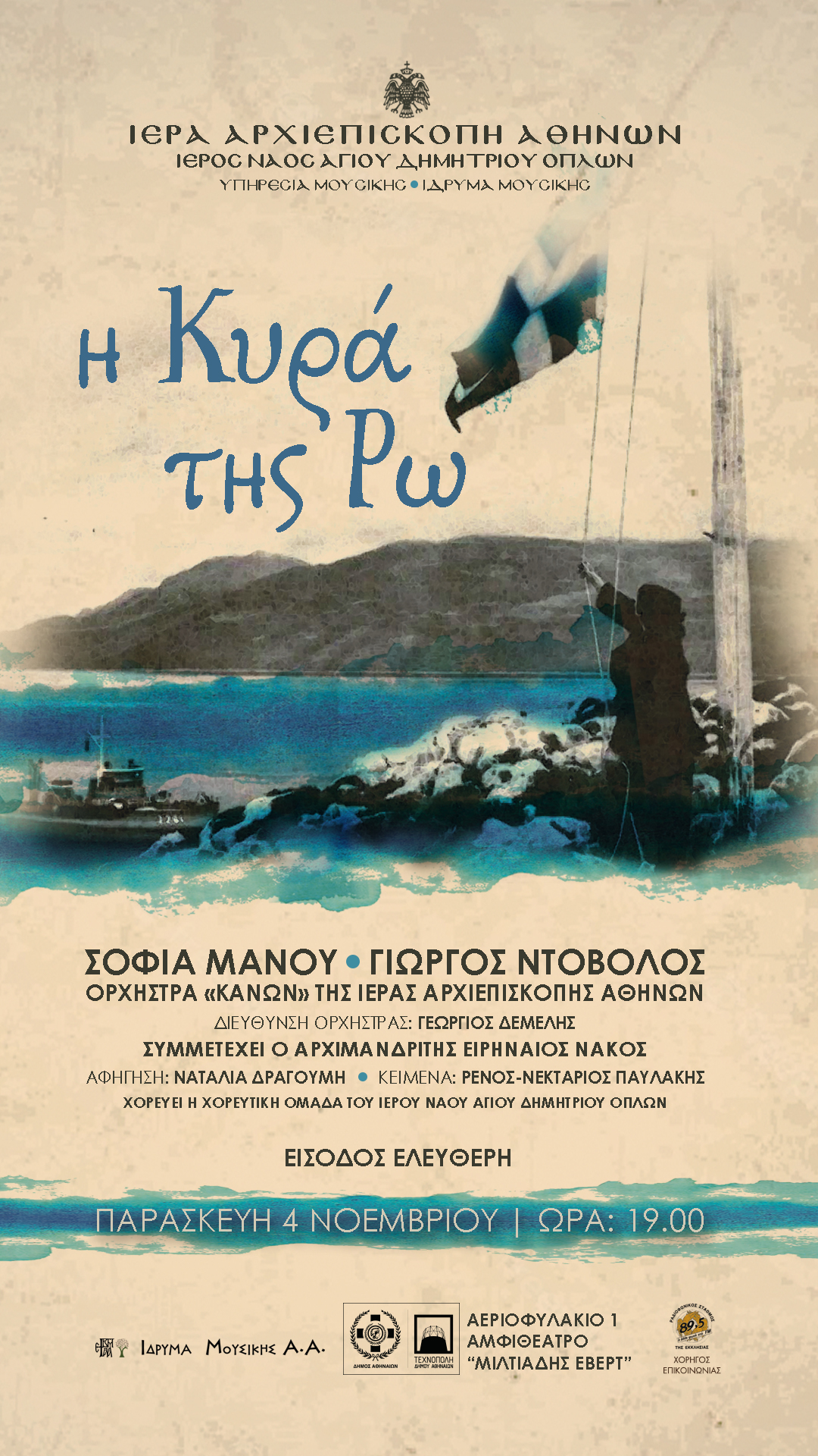 Η Υπηρεσία Διοργανώσεως μουσικών εκδηλώσεων, Βυζαντινής και Ευρωπαϊκής Μουσικής και Ηχογραφήσεων και το Εκκλησιαστικό Ίδρυμα Βυζαντινής και Παραδοσιακής Μουσικής της Ιεράς Αρχιεπισκοπής Αθηνών, σε συνεργασία με τον Ιερό Ναό Αγίου Δημητρίου των Όπλων, διοργανώνουν μια πρωτότυπη θεματική συναυλία με τίτλο «Η Κυρά της Ρω».