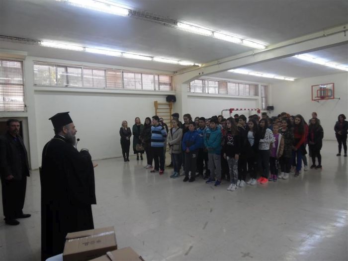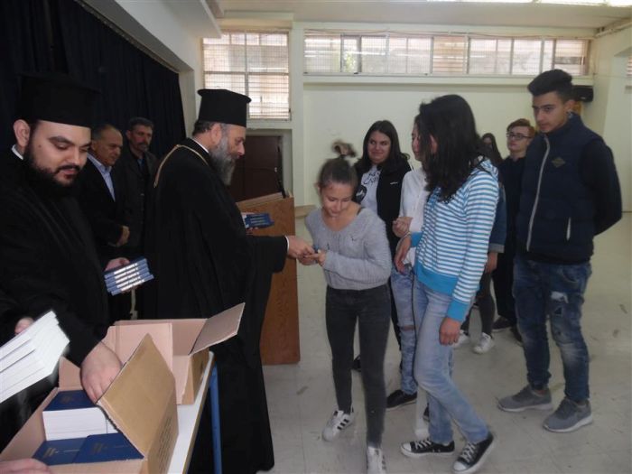 Ο Σεβασμιώτατος μίλησε στα παιδιά και δεχόμενος τις ερωτήσεις τους απάντησε στα διάφορα θέματα που του έθεσαν. Αφού, ευχαρίστησε για την εγκάρδια υποδοχή που του επιφύλαξαν, αλλά και για την πρόσκληση που του απηύθυναν να ξαναβρεθεί κοντά τους μοίρασε σε όλους από μια Καινή Διαθήκη.