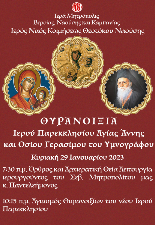 Την Κυριακή 29 Ιανουαρίου το πρωί ο Ποιμενάρχης Βεροίας κ. Παντελεήμων θα ιερουργήσει στον Ιερό Ναό Κοιμήσεως Θεοτόκου Ναούσης και θα τελέσει τα Θυρανοίξια του πρώτου Ναού προς τιμήν του Νέου Αγίου της Εκκλησίας μας, Οσίου Γερασίμου του Υμνογράφου και της Αγίας Θεοπρομήτορος Άννης, στη σκήτη της οποίας ασκήτευσε ο νέος Άγιος της Εκκλησίας και πνευματικός πατέρας του Μητροπολίτου Βεροίας κ. Παντελεήμονος.
