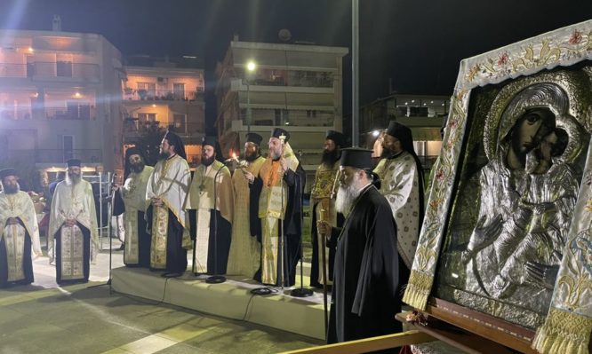 Το Σάββατο 29 Απριλίου 2023 τελέσθηκε η Ακολουθία του Εσπερινού Χοροστατούντος του Σεβασμιωτάτου Μητροπολίτου Τρίκκης, Γαρδικίου και Πύλης κ. Χρυσοστόμου. Πριν το τέλος του Εσπερινού ο Καθηγούμενος της Ιεράς Μονής Αγίας Παρασκευής Γιαννιτσών Πανοσιολογιώτατος Αρχιμανδρίτης Χερουβείμ Τσίνογλου κήρυξε εμπνευσμένα το Θείο Λόγο κάνοντας εκτενή αναφορά στο πρόσωπο της Υπεραγίας Θεοτόκου. Μετά το πέρας ακολούθησε η Ιερά Λιτάνευση της Ιεράς Εικόνος στα στενά της περιοχής του Βαρουσίου με κατεύθυνση την Πλατεία Αριστοτέλη Αντωνίου. Εκεί τελέσθηκε η ακολουθία της Αρτοκλασίας.