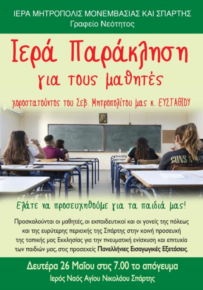 Την Δευτέρα 26 Μαΐου 2025 στις 7.00μ.μ. , στον Ενοριακό Ιερό Ναό Αγίου Νικολάου Σπάρτης, θα τελεσθεί η καθιερωμένη Ιερά Παράκληση για τους μαθητές και τις μαθήτριες, που διαγωνίζονται στις φετινές Πανελλαδικές εξετάσεις, για την εισαγωγή τους στην Τριτοβάθμια Εκπαίδευση. Στην Ιερά Παράκληση θα χοροστατήσει, όπως κάθε χρόνο, ο Σεβασμιώτατος Μητροπολίτης μας κ., Ευστάθιος.