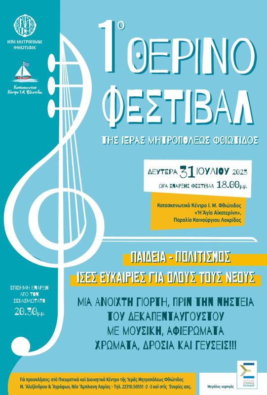 Η Μητρόπολη Φθιώτιδος προσκαλεί στο 1ο ΘΕΡΙΝΟ ΦΕΣΤΙΒΑΛ, το οποίο θα πραγματοποιηθεί στο παραθαλάσσιο και δροσερό Κατασκηνωτικὸ Κέντρο «Η ΑΓΙΑ ΑΙΚΑΤΕΡΙΝΗ» στην παραλία στο Καινούργιο Λοκρίδος την Δευτέρα 31 Ιουλίου 2023 από τις 18.00 μ.μ. έως τα μεσάνυχτα.