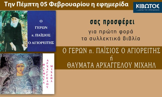 Η εφημερίδα  ΚΙΒΩΤΟΣ ΤΗΣ ΟΡΘΟΔΟΞΙΑΣ Κυκλοφορεί την Πέμπτη  05 Φεβρουαρίου  και σας προσφέρει  για πρώτη φορά   δυο  συλλεκτικά βιβλία για να επιλέξετε ΘΑΥΜΑΤΑ ΑΡΧΑΓΓΕΛΟΥ ΜΙΧΑΗΛ. . Ένα σπάνιο βιβλίο για τον Αρχάγγελο Μιχαήλ τον Ταξιάρχη,  με ιστορίες, διδαχές και τα εξαίρετα θαύματα του. Πολυσέλιδο, έγχρωμο, πολυτονικό, με σπάνιες φωτογραφίες του Αγίου, από όλη την Ελλάδα. […]