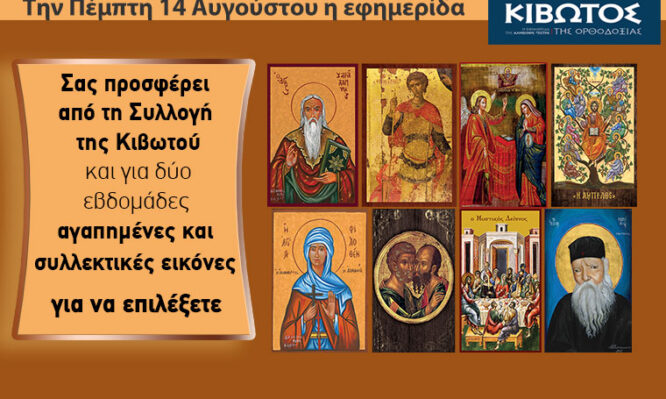 Την  Πέμπτη  14 Αυγούστου η εφημερίδα   Κιβωτός της Ορθοδοξίας κυκλοφορεί για δύο εβδομάδες στα περίπτερα όλης της  χώρας και σας προσφέρει πολλές αγαπημένες εικόνες, για να επιλέξετε. Οι εικόνες που απεικονίζονται είναι ενδεικτικές, υπάρχει μεγάλη ποικιλία εικόνων, αναζητήστε στα περίπτερα την πολύτιμη εικόνα για εσάς!   όλες οι εικόνες είναι ξύλινες με ανάγλυφη χρυσοτυπία βυζαντινής […]