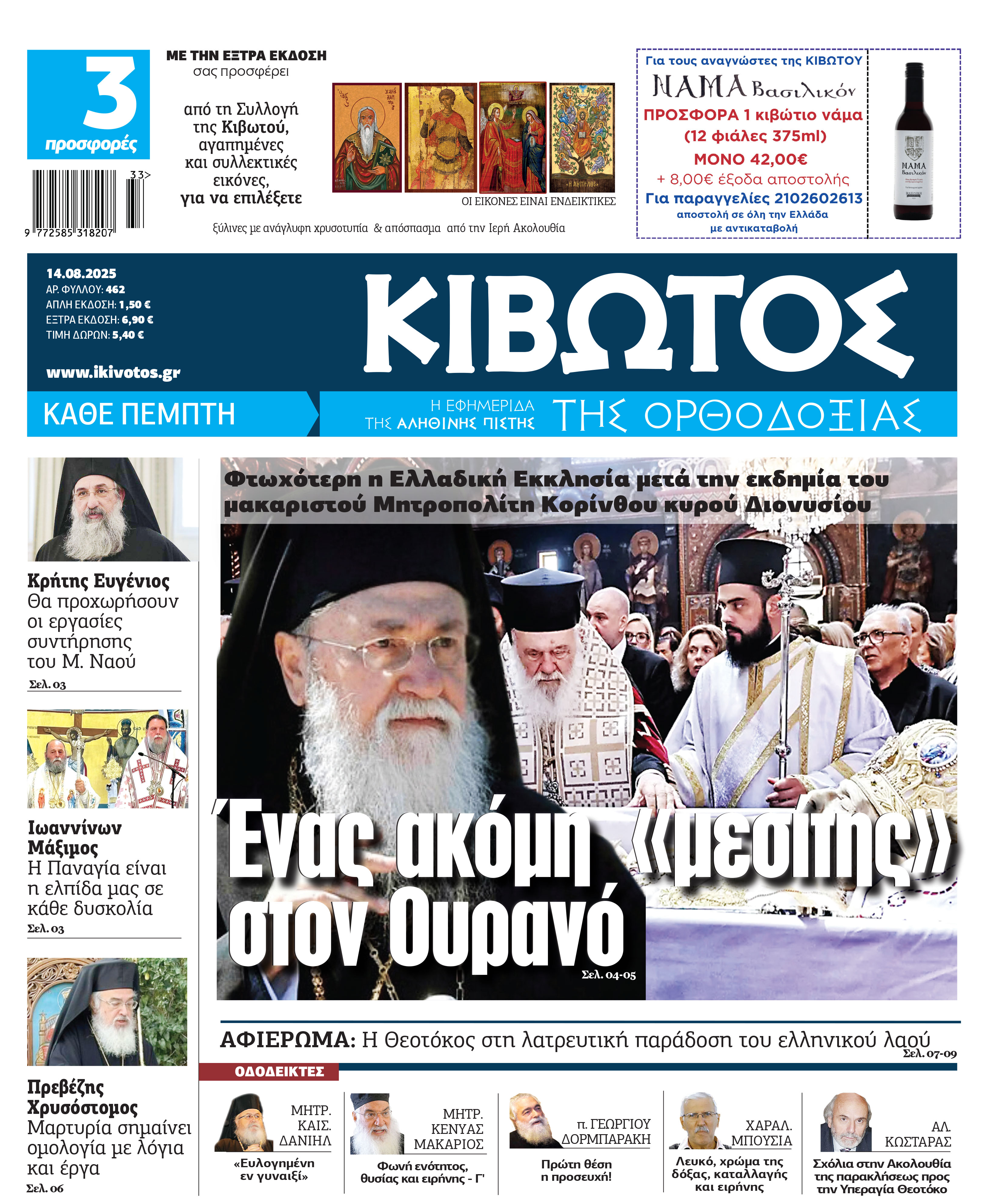 Την Πέμπτη, 14 Αυγούστου, κυκλοφορεί το νέο φύλλο της Εφημερίδας «Κιβωτός της Ορθοδοξίας»