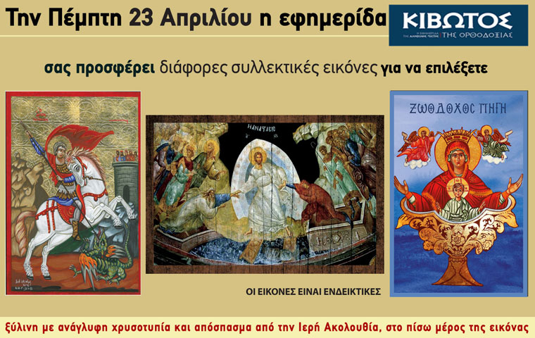 Την Πέμπτη 23 Απριλίου, η εφημερίδα Κιβωτός της Ορθοδοξίας, κατόπιν μεγάλης ζήτησης, επανακυκλοφορεί ολόκληρη την Συλλογής της και κάθε εβδομάδα σας προσφέρει πολλές αγαπημένες εικόνες για να επιλέξετε. Οι εικόνες που απεικονίζονται είναι ενδεικτικές, υπάρχει μεγάλη ποικιλία εικόνων, αναζητήστε στα περίπτερα την πολύτιμη εικόνα για εσάς!
