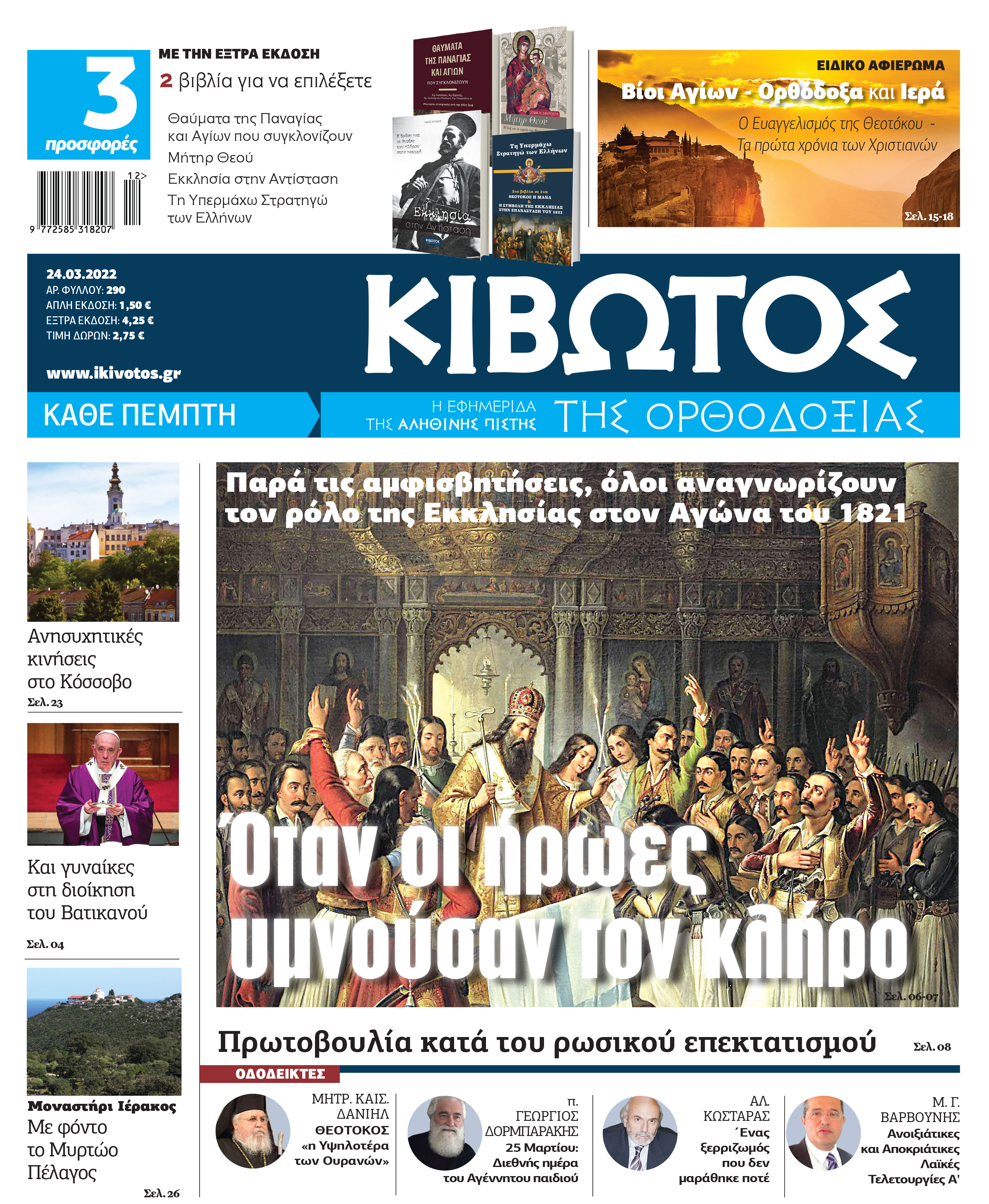 Την Πέμπτη, 24 Μαρτίου, κυκλοφορεί το νέο φύλλο της εφημερίδας ΚΙΒΩΤΟΣ ΤΗΣ ΟΡΘΟΔΟΞΙΑΣ