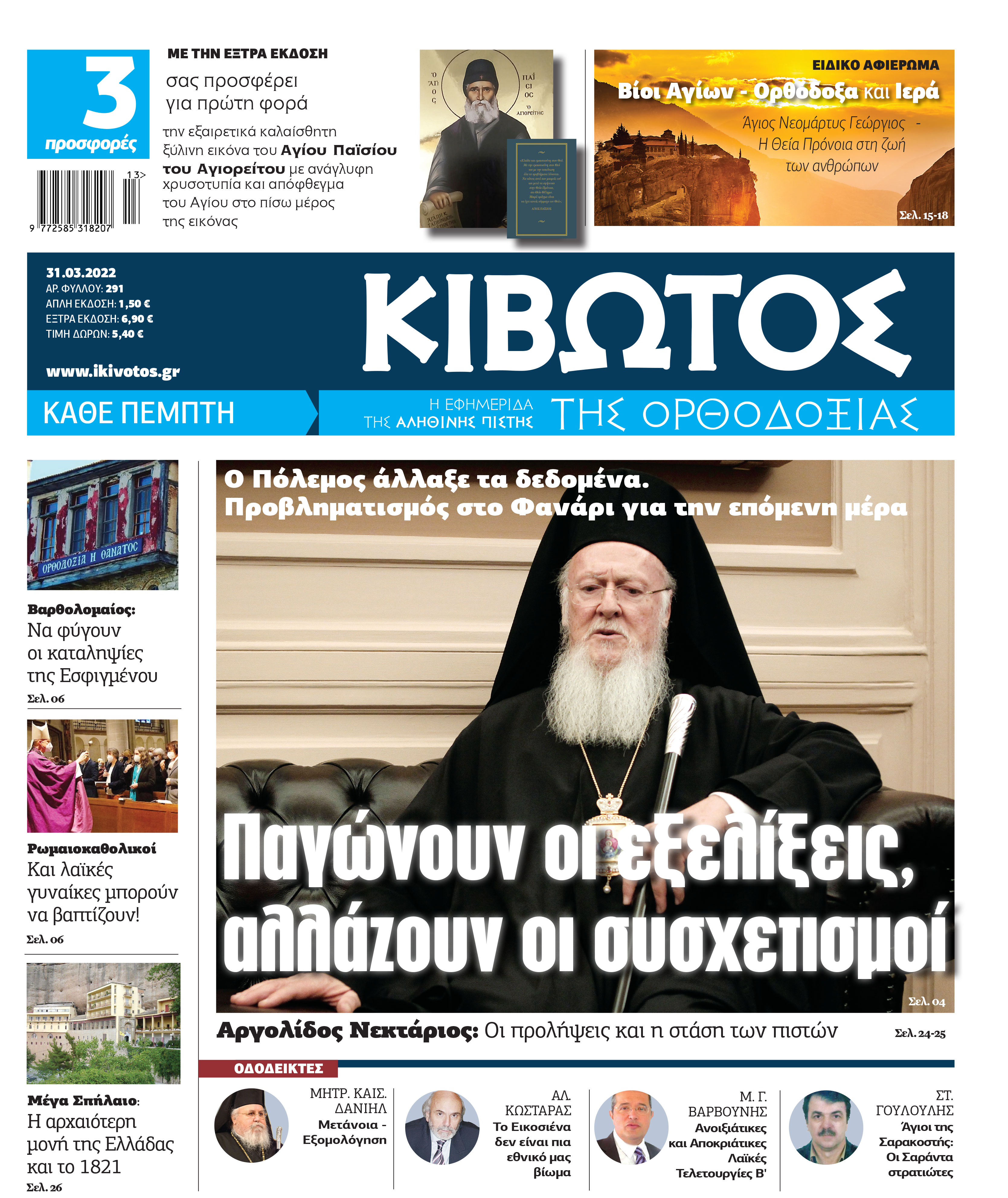 Την Πέμπτη, 31 Μαρτίου, κυκλοφορεί το νέο φύλλο της εφημερίδας ΚΙΒΩΤΟΣ ΤΗΣ ΟΡΘΟΔΟΞΙΑΣ