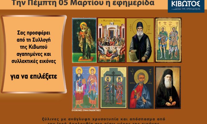 Την Πέμπτη 05 Μαρτίου, η εφημερίδα Κιβωτός της Ορθοδοξίας, κατόπιν μεγάλης ζήτησης, επανακυκλοφορεί ολόκληρη την Συλλογή της και κάθε εβδομάδα σας προσφέρει πολλές αγαπημένες εικόνες για να επιλέξετε Οι εικόνες που απεικονίζονται είναι ενδεικτικές, υπάρχει μεγάλη ποικιλία εικόνων, αναζητήστε στα περίπτερα την πολύτιμη εικόνα για εσάς! Για παλαιότερα βιβλία και εικόνες που κυκλοφόρησαν με το […]