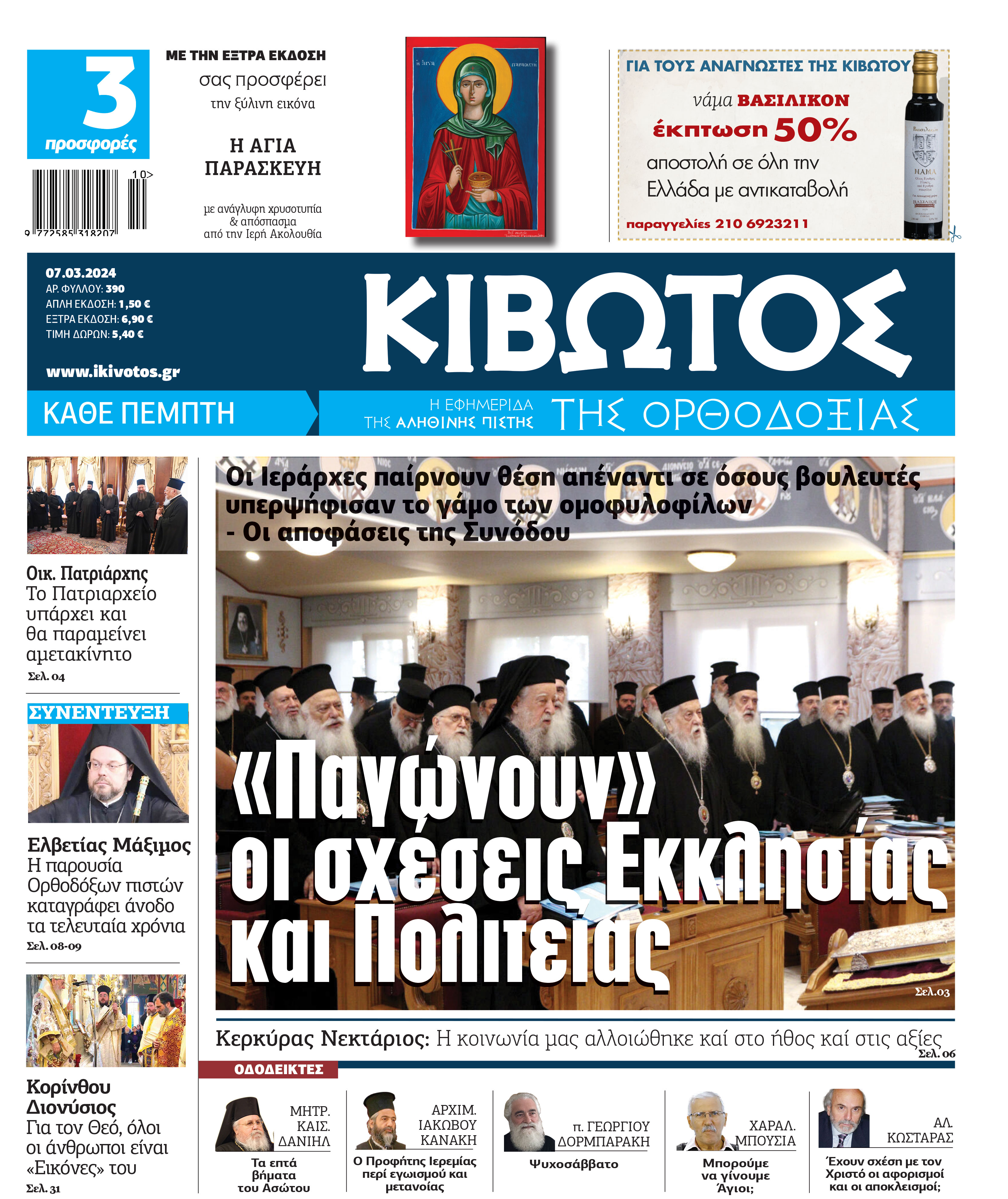 Την Πέμπτη, 7 Μαρτίου, κυκλοφορεί το νέο φύλλο της Εφημερίδας «Κιβωτός της Ορθοδοξίας»