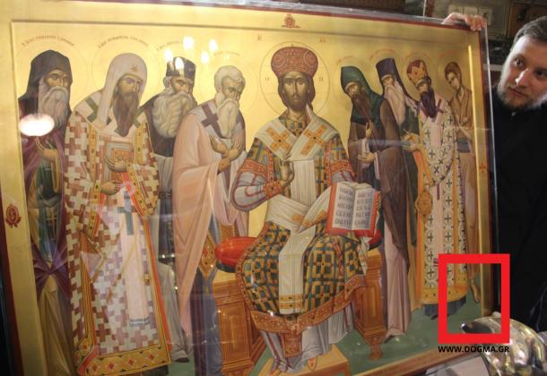 Αυτή η εικόνα στην οποία εμφανίζεται ένθρονος ο Ιησούς Χριστός πλαισιωμένος από Έλληνες και Ρώσους Αγίους είναι το δώρο που έκανε στον Πατριάρχη Κύριλλο της Ρωσίας, ο Αρχιεπίσκοπος Αθηνών και Πάσης Ελλάδος κ. Ιερώνυμος.