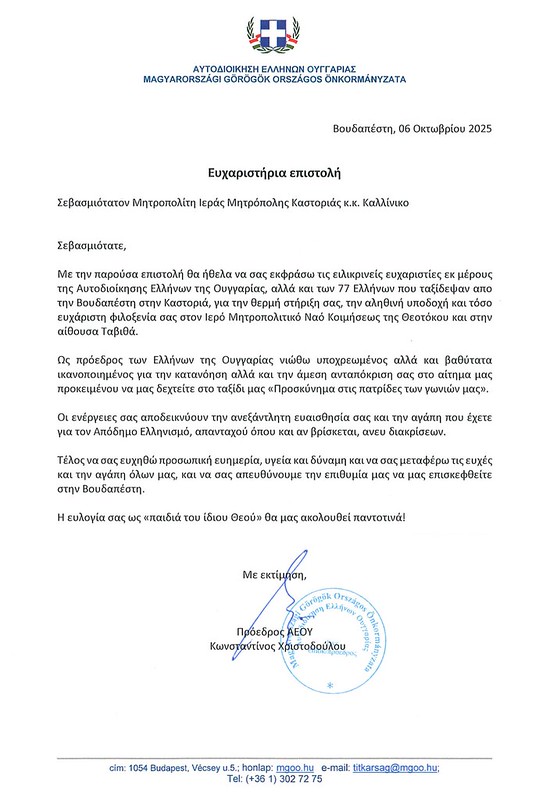 Το ευχαριστήριο των Ούγγρων στον Μητροπολίτη Καστορίας