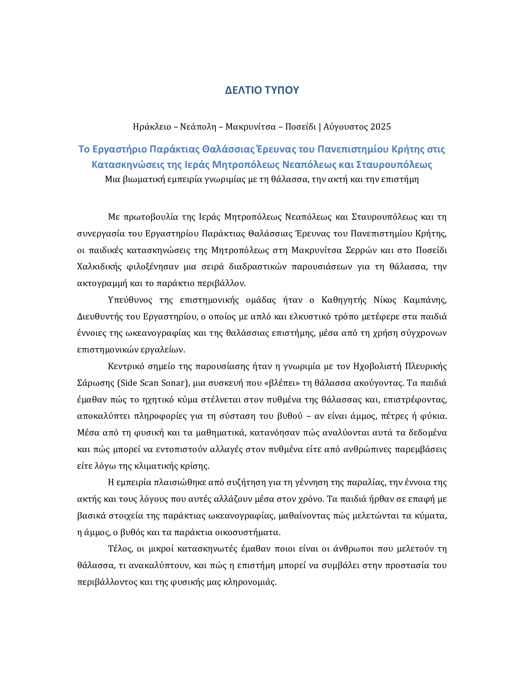 Το Εργαστήριο Παράκτιας Θαλάσσιας Έρευνας του Πανεπιστημίου Κρήτης στη Νεάπολη Δόγμα 07 Αυγούστου 2025 19:17 Tags: ΜΗΤΡΟΠΟΛΗ ΝΕΑΠΟΛΕΩΣ