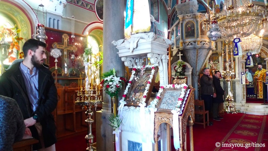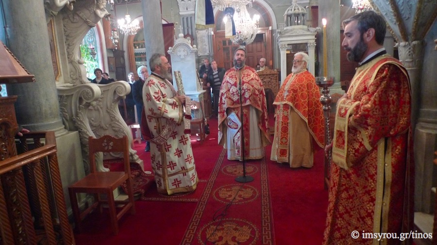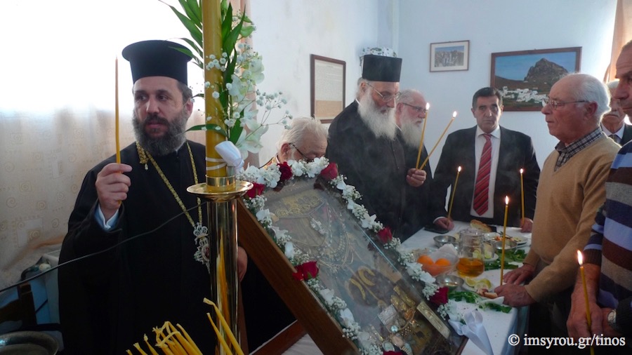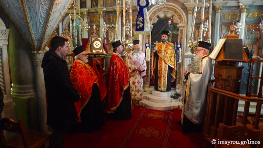 Συμμετείχαν, ο Αρχιερατικός Επίτροπος της ιεράς νήσου Τήνου, Πρωτοπρ. Γεώργιος Φανερός, η οικογένεια του οποίου είχε την ευλογία να διακονήσει την παράδοση αυτή τη χρονιά που πέρασε, ο Εφημέριος του χωριού και Κληρικοί του νησιού, ο Δήμαρχος Τήνου, ο Πρόεδρος του Δημοτικού Συμβουλίου, ο Λιμενάρχης Τήνου, ο Πρόεδρος του Συλλόγου «Ο Κάβος», ο Πρόεδρος του Συλλόγου «Ο Άγιος Τρύφων», οι Επίτροποι του Ναού, οι Ιεροψάλτες και οι ενορίτες του χωριού. Ο Αρχιερατικός Επίτροπος προ της παράδοσης του «Κάβου» στην επόμενη οικογένεια απηύθυνε τον λόγο ερμηνεύοντας το “Έθιμο της αγάπης” και αφιέρωσε χάριν ευλαβείας, σεβασμού και ευγνωμοσύνης, ασημένιο Δισκοπότηρο μετά ιερού Δισκαρίου, Αστερίσκου, Λόγχης και Λαβίδος προς τον Ενοριακό Ι.Ν. Εισοδίων Θεοτόκου, καθώς και επιστήθιο Σταυρό προς τον Εφημέριο του χωριού π. Σπυρίδωνα Φώσκολο.