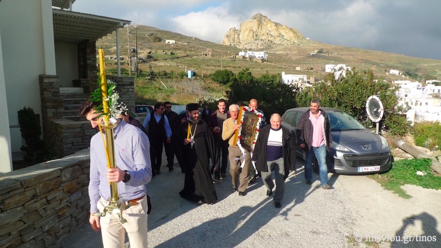 Με την ευλογία του Μητροπολίτη Σύρου, Τήνου, Άνδρου, Κέας και Μήλου κ. Δωροθέου Β’, το “‘Εθιμο της αγάπης” ξεκίνησε στις 12.00 το μεσημέρι με τη λιτανεία της εικόνας της Χριστού Γεννήσεως σε όλο το χωριό. Ακολούθως, στην ενοριακή αίθουσα του Ι.Ν. Εισοδίων Θεοτόκου παρετέθη παραδοσιακή τράπεζα, όπου πραγματοποιήθηκε η τελετή παράδοσης-παραλαβής της εικόνος της Χριστού Γεννήσεως, δηλαδή της ανάληψης συγκεκριμένων ενοριακών υποχρεώσεων από τον «Κάβο».