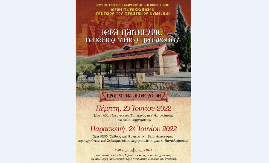 Την Παρασκεύη, 24 Ιουνίου 2022, πανηγυρίζει το εκκλησάκι του Τιμίου Προδρόμου, στο Άλσος της Νυμφαίας, σύμφωνα με το ακόλουθο Πρόγραμμα:
