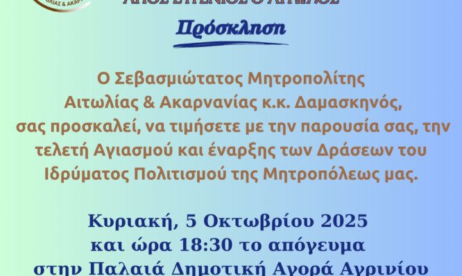 Την προσεχή Κυρικαή, 5 Οκτωβρίου 2025 και ώρα 6:30 το απόγευμα, στην αίθουσα της Παλαιάς Δημοτικής Αγοράς Αγρινίου, θα πραγματοποιηθεί  από τον Σεβασμιώτατο Μητροπολίτη Αιτωλίας και Ακαρνανίας κ. Δαμασκηνό. η τέλεση του Αγιασμού για την έναρξη των φετινών μαθημάτων και δράσεων του Ιδρύματος Πολιτισμού της Τοπικής μας Εκκλησίας  «ΑΓΙΟΣ ΕΥΓΕΝΙΟΣ Ο ΑΙΤΩΛΟΣ΄». Έπειτα από δύο […]